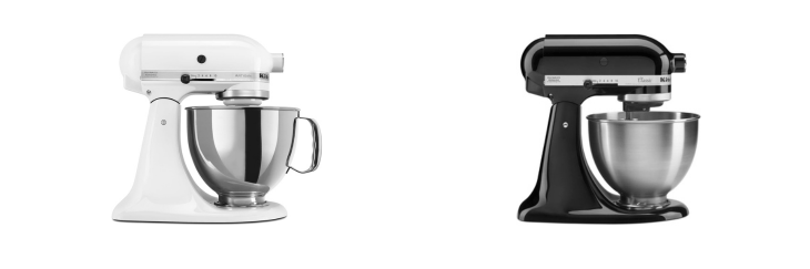 - KitchenAid Artisan comes with a 5-quart stainless steel bowl to handle larger batch sizes and more ingredients at once, while the KitchenAid Classic includes a smaller 4.5-quart bowl.